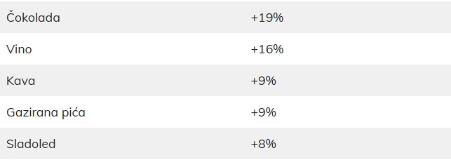 Vino je ove godine poskupjelo za 16 posto, ali prodaja mu je količinski pala za četiri posto. Salame su skuplje za osam posto (prodane količine su iste), gazirana pića devet posto (količina ista).