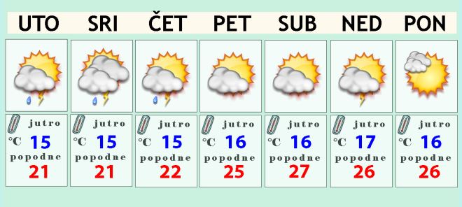 Promjenjivo vrijeme bi se trebalo zadržati i tijekom utorka. Izmjena oblaka i sunčanih radoblja, ali povremeno može biti kiše i grmljavinskih pljuskova, mjestimice i obilnijih. Temperatura zraka malo niža pa će se uglavnom držati između 20 i 24 Celzijeva stupnja.