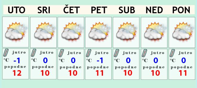 Temperatura zraka bez veće promjene tako da bi dnevni maksimalac trebao biti oko 10 Celzijevih stupnjeva, samo u slučaju dugotrajne magle nešto niže. Noći će biti hladne, a ako bude vedrine moguć je i slab mraz.