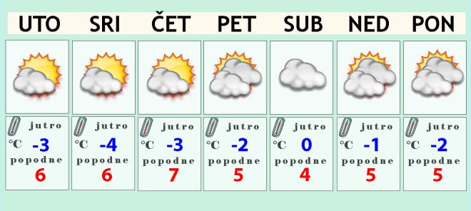 Utorak nam donosi suho i prohladno vrijeme. Izmjenjivat će se oblaci i duža sunčana razdoblja, a vjetar će oslabjeti i prestati. Temperatura će noću otići koji stupanj ispod nule, a danju bi se trebala držati uglavnom između 4 i 7 Celzijevih stupnjeva.