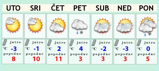 Prognostički modeli predviđaju promjenu vremena u petak. Naoblačenje i oborine uz okretanje vjetra s jugozapadnog na sjeverni. U početku kiša, ali je s padom temperature moguća susnježica, mjestimice i snijeg. Temperatura značajno niža nego prethodnih dana, ali ostajemo u nekom blagom plusu.
