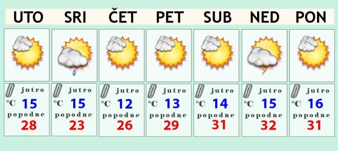 VREMENSKA PROGNOZA: Utorak će proći suho uz puno sunca i većinom slab vjetar. Jutarnja temperatura od 13 do 17, a najviša dnevna u polaganom porastu. No, zasad nisu na vidiku nove vrućine jer će maksimalna temperatura u utorak poslijepodne ostati između 28 i 30 stupnjeva.