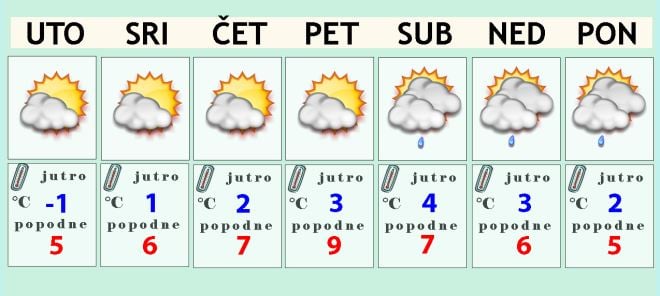 Malo pomalo će sredinom tjedna temperatura rasti. U srijedu ujutro oko nule ili u sasvim slabom minusu, ali danju će uz sunčana razdoblja i umjeren jugozapadni vjetar porasti nekoliko stupnjeva u plus.