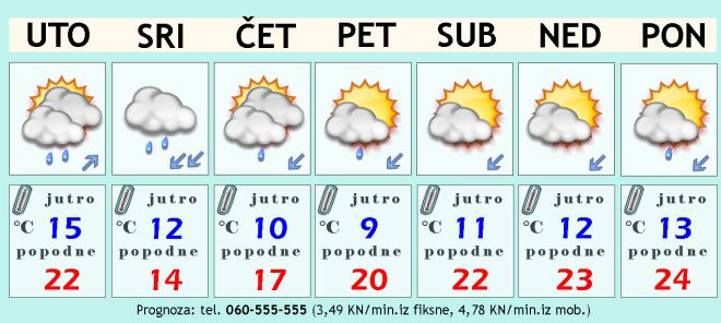 U utorak izmjena oblaka i kraćih sunčanih razdoblja, ali su tijekom dana mogući lokalni pljuskovi s grmljavinom ili kakav nalet kiše, osobito popodne i navečer. Temperatura zraka kretat će se od 14°C ujutro do ugodnih dvadesetak stupnjeva u popodnevnim satima, možda i do 23°C. Još uvijek ćemo biti izloženi južini, sparini i nepovoljnoj biometeorološkoj situaciji.