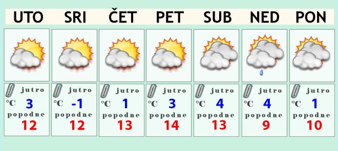 U utorak je dnevna temperatura oko desetke ili malo iznad, a ni u srijedu nema neke bitnije promjene vremena. I dalje će dominirati suho vrijeme sa sunčanim razdobljima. Ni temperatura zraka neće imati neke velike skokove, ostaje relativno toplo. Zbog vedrije noći će nam jutarnja temperatura biti uglavnom između -2 i 2 pa može biti slabog mraza, a najviša dnevna oko 12 Celzijevih stupnjeva.
