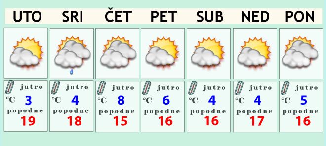 Mirno bi se vrijeme onda trebalo zadržavati i sredinom tjedna. Nema nekog velikog pogoršanja ni velikog zahladnjenja, ali će biti dosta oblaka, u jutarnjim satima i mjestimične magle. Ipak su sredinom dana i poslijepodne moguća i kraća sunčana razdoblja. Potkraj srijede ili u noći na četvrtak postoji šansa i za malo kiše. Temperatura zraka će danju ostati oko 15-ak Celzijevih stupnjeva ili malo iznad.