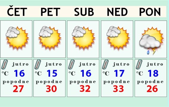 Petak i subota i dalje će nam ponuditi puno sunčanog i vrućeg ljetnog vremena. I dalje bi temperatura zraka sredinom dana i poslijepodne trebala biti viša od 30 Celzijevih stupnjeva, možda čak i oko 33°C. Treba pripaziti na jako sunce sredinom dana, osobito između 10 i 17 sati kad je i UV indeks najviši.
