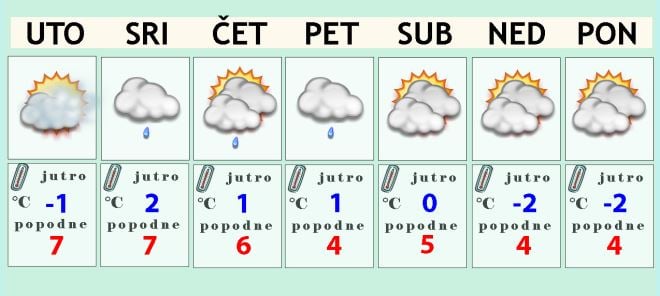U utorak danju očekujemo i nešto sunca pa će popodnevna temperatura vjerojatno narasti na 7 ili 8 Celzijevih stupnjeva, ponegdje uz južinu i malo više.
