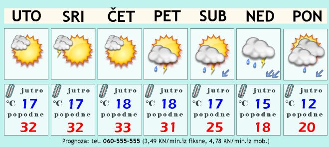 Prema svemu sudeći ljetno vrijeme će se nastaviti i do sredine tjedna. U utorak i srijedu uglavnom suho i sunčano, rijetko gdje je moguć neki zalutali pljusak. Temperatura zraka prava ljetna, svaki dan malo preko 30 Celzijevih stupnjeva. Najtoplije bi trebalo biti baš oko srijede i četvrtka kad možda uhvatimo 33 stupnja.