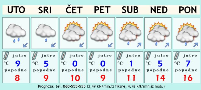 Bit će oblačno uz umjeren i pojačansjeverni i sjeveroistočni vjetar, povremenu kišu i osjetan pad temperature zraka. To ovdje kod nas na sjeveru općenito nije neka obilna kiša, ali trebalo bi pasti između 3 i 8 mm. Zahladit će za desetak stupnjeva u odnosu na ovo toplo razdoblje u kojem smo bili do sada. To znači da temperatura zraka tijekom utorka zapravo uopće neće rasti, čak je moguće da poslijepodne bude hladnije od jutra. Sve će to biti između 7 i 10 Celzijevih stupnjeva.