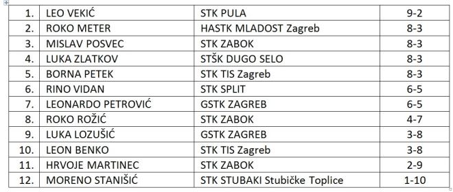 Roko Rožić je s omjerom 4-7 osvojio osmo, Hrvoje Martinec imao je omjer 2-9 što mu je bilo dovoljno za 11. mjesto, dok je Moreno Stanišić bio posljednji, dvanaesti, s omjerom 1-10. Svakako vrijedi istkanuti da je Martinec jednu od svoje dvije pobjede ostvario protiv Roka Metera.