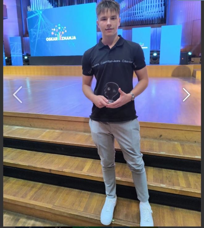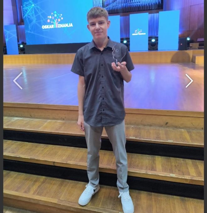 Karlo Krušlin (1.abt) za osvojeno 1. mjesto na Državnom natjecanju iz geografije u A kategoriji (mentorica Vesna Pušelj)