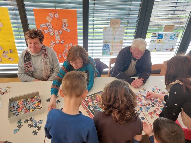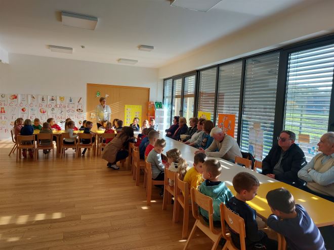 Budući da je za srijedu bila predviđena tema mlijeko i sir, u vrtiću su odlučili pozvati naše umirovljenike na zdravi doručak i druženje s mališanima. Ravnateljica Ana Ricijaš izrazila je dobrodošlicu svima, a zdravstvena voditeljica Vlatka Šoban održala je kratko predavanje o važnosti zdrave prehrane, osobito doručka. Djeca su bila znatiželjna kakve su igre umirovljenici igrali dok su bili mali te što se jelo za doručak kad su naši umirovljenici bili djeca. Nakon doručka uslijedilo je vrijeme za igru i druženje: djeca su s umirovljenicima slagali slagalice, crtali i uveseljavali jedni druge svojim pričama.