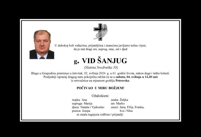 Posljednji ispraćaj Vida Šanjuga održat će se u subotu, 04. svibnja u 13:30 sati iz mrtvačnice na mjesnom groblju Petrovsko.
