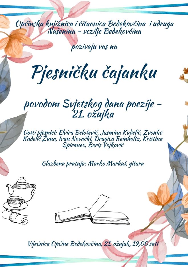 Općinska knjižnica i čitaonica Bedekovčina poziva na 'Pjesničku čajanku', koja je na rasporedu u utorak 21. ožujka u 19,00 sati u općinskoj vijećnici, a koju knjižnica organizira zajedno s udrugom ''Našenina - vezilje Bedekovčina'' i to četvrtu godinu zaredom. Uz raznovrsne pjesničke glasove domaćih poznatih i priznatih pjesnika/pjesnikinja, glazbenu pratnju, čaj, kolače i ethno ozračje ujedno će se obilježiti i Svjetski dan poezije.