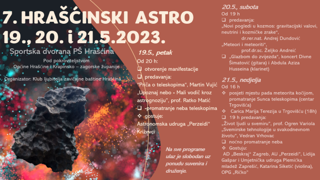Pod pokroviteljstvom Oopćine Hrašćina i Krapinsko – zagorske županije, u petak 19. svibnja otvara se 7. Hrašćinski astro. Manifestaciju organizira Klub ljubitelja zavičajne baštine Hraščina, a program i ove godine obiluje zanimljivim događanjima. Nakon samog otvorenja, od 20 sati, posjetitelji će moći poslušati predavanja ‘Priča o teleskopima’ Martina vujića i ‘Upoznaj nebo – mali vodič kroz astrognoziju’ prof. Ratka Matića, a potom slijedi promatranje neba teleskopima. Gostuje Astronomska udruga ‘Perzeidi’ iz Križevaca.