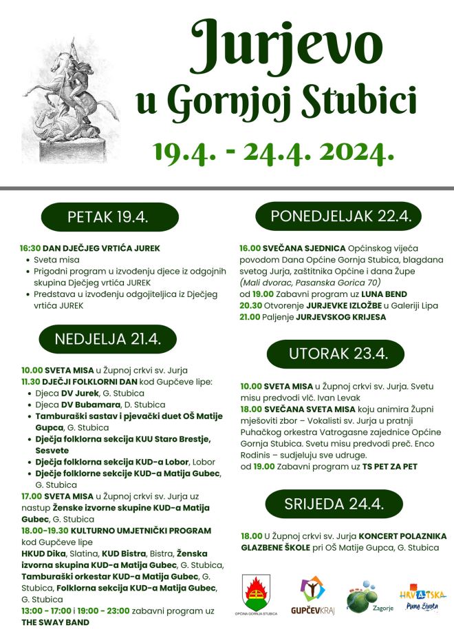 Gornja Stubica uskoro slavi svoj dan i dan svog zaštitnika, svetog Jurja. Jurjevo u Gornjoj Stubici ima dugogodišnju tradiciju, pa je tako i ove godine pripremljen program kroz nekoliko dana.