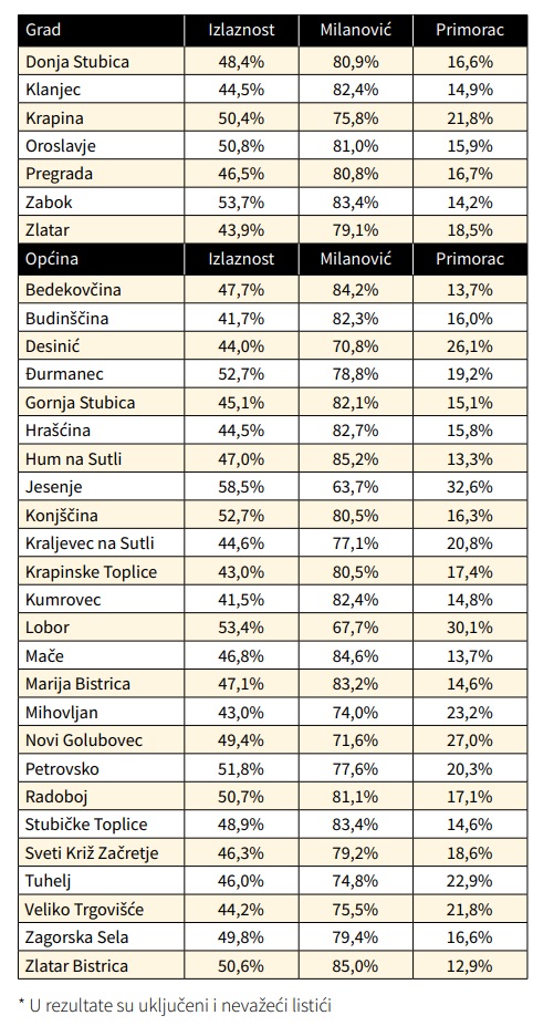 S obzirom na dostupne podatke, kad su u pitanju zagorski gradovi i općine, analizirali smo postotke s uključenim nevažećim listićima, dakle, zbroj postotka osvojenih glasova oba kandidata ni u jednom slučaju neće biti 100, već dio 'otpada' na nevažeće listiće.