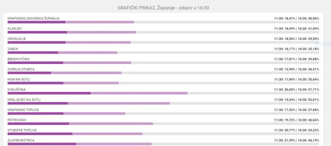 U gradu Klanjcu odaziv birača do 16.30 je 41,09%, u Oroslavju 39,50%, a u Zaboku 35,18%.