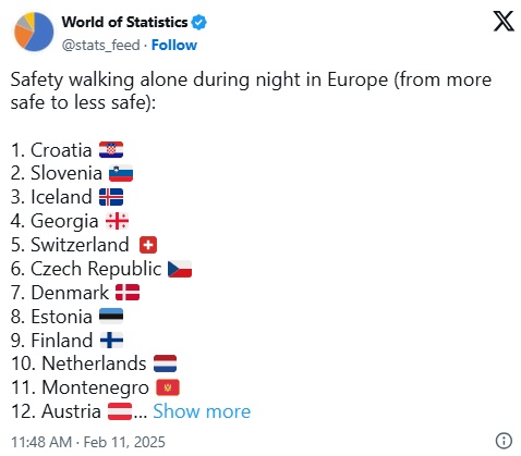 Ako planirate šetnje noću kroz Europu, možda vas zanima koliko je to sigurno u različitim zemljama. Prema podacima Numbeoa, sigurnost u noćnim šetnjama varira od zemlje do zemlje. Hrvatska se našla na prvom mjestu, a slijede je naši susjedi, što samo potvrđuje kako su sigurnost i kvaliteta života u ovom dijelu Europe na vrlo visokom nivou.