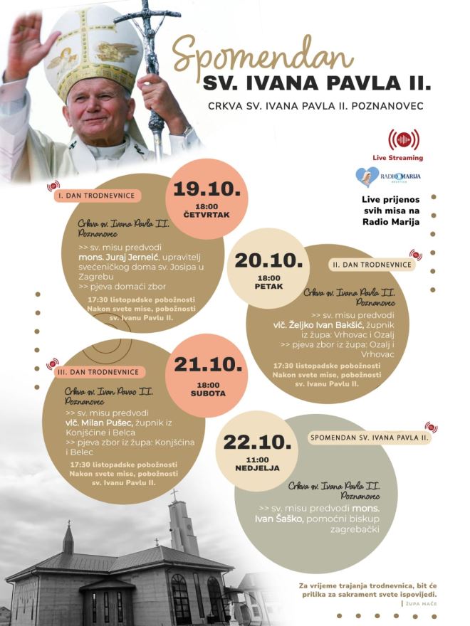 Proslava spomendana sv. Ivana Pavla II. u filijalnoj crkvi u Poznanovcu počet će s trodnevnicama koje će se održati 19., 20. i 21. listopada kada mise počinju u 18 sati, a 22. listopada održat će se sveta misa s početkom u 11 sati.