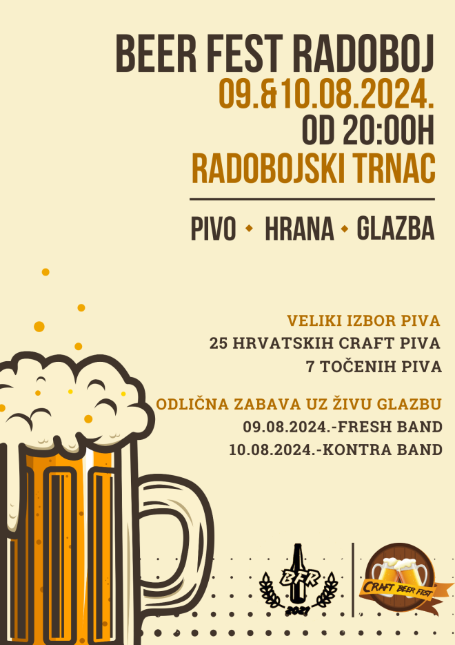 Općina Radoboj u okviru 8. Radobojskih ljetnih događanja i ove godine organizira 4. BEER FEST RADOBOJ, a trajat će dva dana; petak i subotu, 9. i 10. kolovoza 2024. s početkom u 20:00 h.