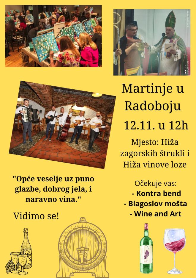 Martinje će se obilježiti i u Radoboju i to ove subote 12. studenoga. Mjesto održavanje je Hiža zagorskih štrukli i Hiža vinove loze, a organizatori najavljuju Blagoslov mošta, uz nastup Kontra banda, a Savjet mladih Općine Radoboj organizira i događanje pod nazivom ''Art and wine''.