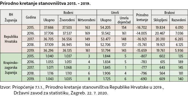 Najveće su demografske negativnosti u Krapinsko-zagorskoj županiji vezane za prirodni pad stanovništva koji traje prema službenim dostupnim podacima Državnog zavoda za statistiku RH neprekinuto od 1996. godine u godišnjem rasponu od -481 do -824 osobe (prosječno oko 650 soba). Preko 16 000 osoba je izgubljeno u tom razdoblju samo prirodnim putem, a u zadnjih pet godina (2015.-2019.) 3853 osobe. Iako je prirodni pad županijskog stanovništva konstanta njegova je razina u odnosu na druge županije i u odnosu na ukupno stanovništvo relativno niža. Posebno zabrinjava smanjivanje broja učenika osnovnih i srednjih škola na godišnjoj razini; npr. samo je o odnosu na prošlu školsku godinu 282 učenika manje.