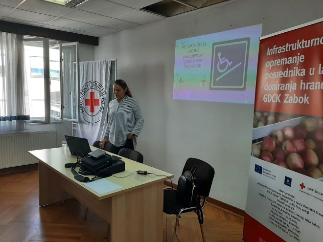 U sklopu projekta „Infrastrukturno opremanje posrednika u lancu doniranja hrane – GDCK Zabok“ u Zaboku je 01. rujna 2023. godine održana dvosatna edukaciju na temu „Pristupačnost građevinama i postupanje s osobama s invaliditetom“ za djelatnike i volontere Gradskog društva Crvenog križa Zabok koji u skladištu i na terenu obavljaju aktivnosti prihvata, skladištenja i distribucije donirane hrane, te izravno komuniciraju s krajnjim primateljima.