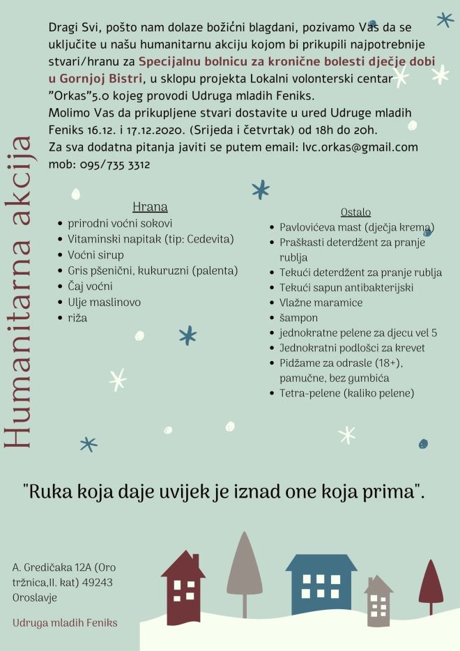 Dolaze nam božićni blagdani, a kako bi oni bili što ljepši i topliji, pozivamo Vas da se uključite humanitarnu akciju Lokalnog volonterskog centra Orkas kojom bi se prikupile najpotrebnije stvari/hrana za Specijalnu bolnicu za kronične bolesti dječje dobi u Gornjoj Bistri, u sklopu projekta Lokalni volonterski centar „Orkas“ 5.0 kojeg provodi Udruga mladih Feniks.