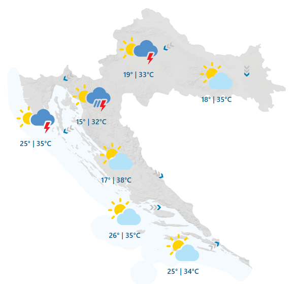 - U drugom dijelu dana naoblačenje, lokalno moguće malo kiše ili pljuskovi praćeni grmljavinom. Ponegdje mogu biti izraženi, osobito u Gorskoj i središnjoj Hrvatskoj. Zapuhat će umjeren sjeverni i sjeveroistočni vjetar. U Dalmaciji umjeren sjeverozapadni i jugozapadni vjetar, dok će na sjevernom dijelu zapuhati bura i jačati krajem dana. Najniža temperatura zraka većinom od 15 do 20, a na Jadranu od 21 do 26 °C. Najviša od 31 do 36, u Dalmaciji i do 38 °C - javlja DHMZ.