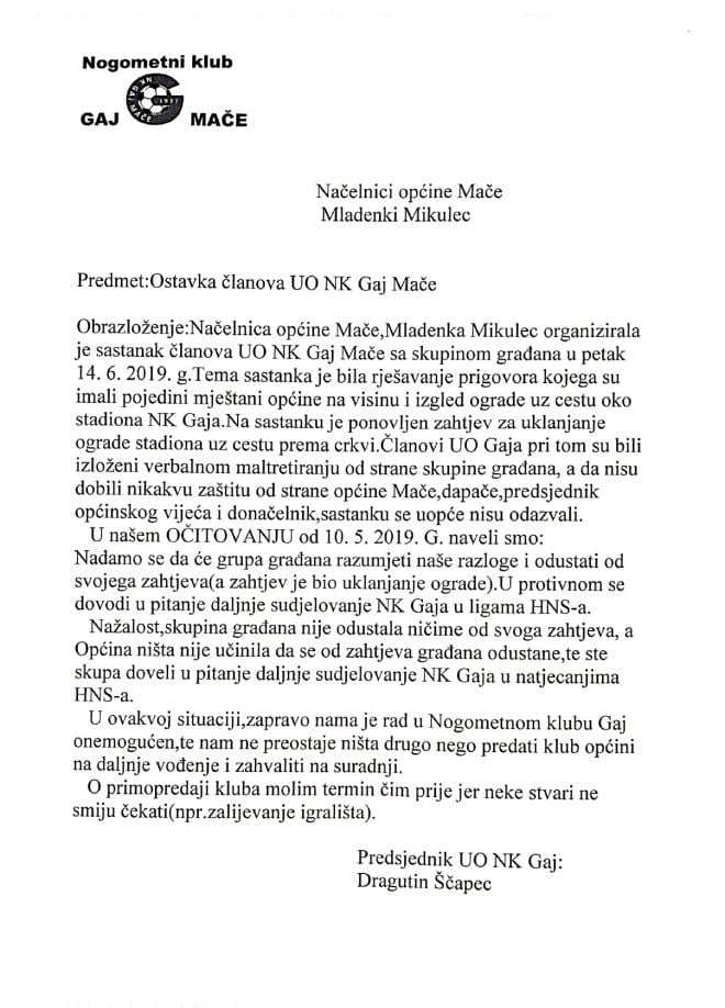U nastavku pročitajte priopćenje za javnost Upravnog odbora i pismo predsjednika UO NK Gaj, Dragutina Ščapeca, načelnici Mladenki Mikulec.