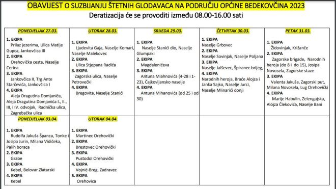 Uskoro kreće preventivna deratizacija na području Općine Bedekovčina Autor: zagorje.com 21 ožujka, 2023. 16:30 ispis Tweet Share on Facebook Plus on Google+ Plan provedbe preventivne i obvezne preventivne deratizacije na području Općine Bedekovčina provodit će se u razdoblju od 27.03. do 04.04.2023. godine prema planu: