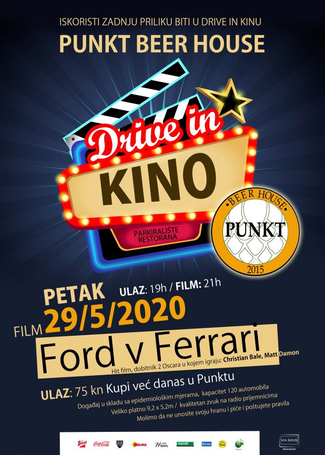 Nakon velikog interesa, Punkt vam daje još jednu priliku da uživate u drive in kinu u petak 29. svibnja. Kako bi smanjili gužve već danas puštamo u prodaju konzumacijsku ulaznicu koju možete kupiti na šanku Punkta. Svi posjetitelji u svojim automobilima moći će uživati u vrhunskom filmu Ford vs Ferrari (2019) dobitniku 2 oskara naslovima uz ukusnu hranu i pića restorana Punkt Beer House. Zvuk filma reproducirati će se putem radio valova na radio prijamnike u automobilima i dva velika zvučnika kod platna.Svi će biti zadovoljni jer veličina platna je 9,2 x 5,2 metara, jednako kao u kinu. Ulaz je menu + piće + film po osobi. Na parkiralište se ulazi od 19 sati a projekcija filma počinje u 21 sat.