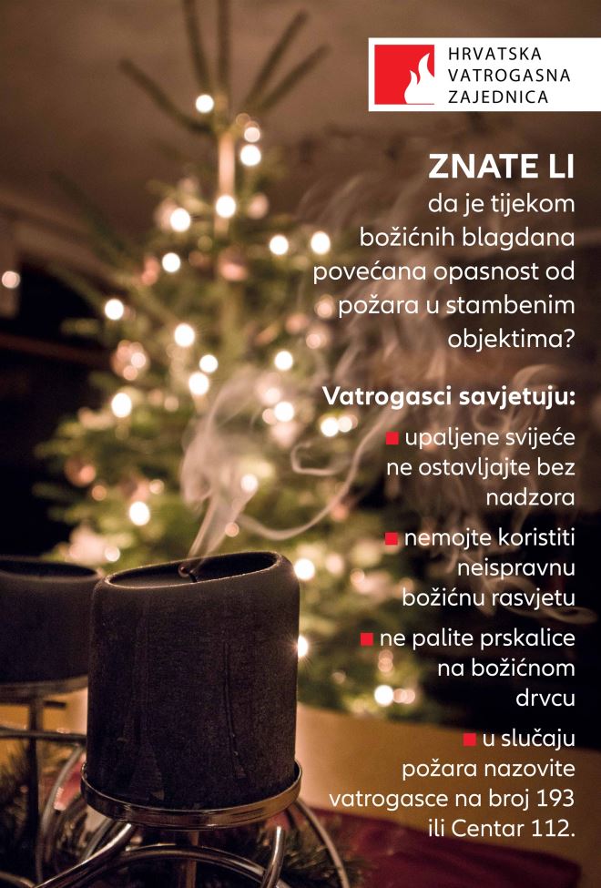 U predstojećem adventskom razdoblju povećava se opasnost od izbijanja požara u stambenim objektima zbog neopreznog korištenja blagdanskih dekoracija, od lampica do svijeća i prskalica. Osobito je važno naglasiti kako suha božićna drvca i razne plastične dekoracije lako gore te se požar brzo može proširiti na okolni namještaj.