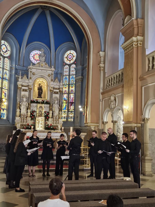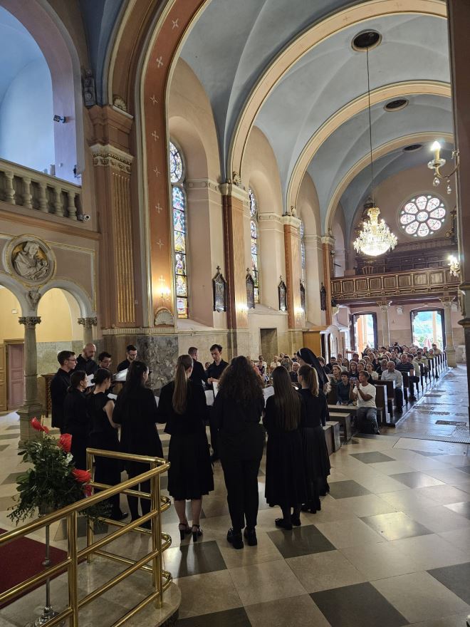 Oni su naime bili u posjetu sestrama u Karmelu, pa su posjetili i Župu gdje su ih dočekali rektor, preč. Tomica Šestak i župni vikar vlč. Vedran Jakić. Sastav Schola cantorum gregoriana čine Beatricija Barić, s. Anđela Crnjac, Mihaela Lasić, Lucija Pahljina, Petra Pleš, Gracijela Slukić, Amalija Štuban, Samanta Totović, Mirjam Uremović, Neven Boltek, Matija Đurašin, Ivan Madunić, Kristijan Martinec, Bruno Radešić, Stjepan Vugdelija. Orgulje su svirali Mihaela Lasić, Lucija Pahljina i Bruno Radešić. Narator je bio Mato Zirdum, bogoslov i sakristan u Svetištu. Dirigenti su bili Neven Boltek koji je nastavnik i umjetnički voditelj i Kristijan Martinec, student crkvene glazbe. U Svetištu se nadaju i budućoj suradnji s ovim zanimljivim i perspektivnim sastavom.