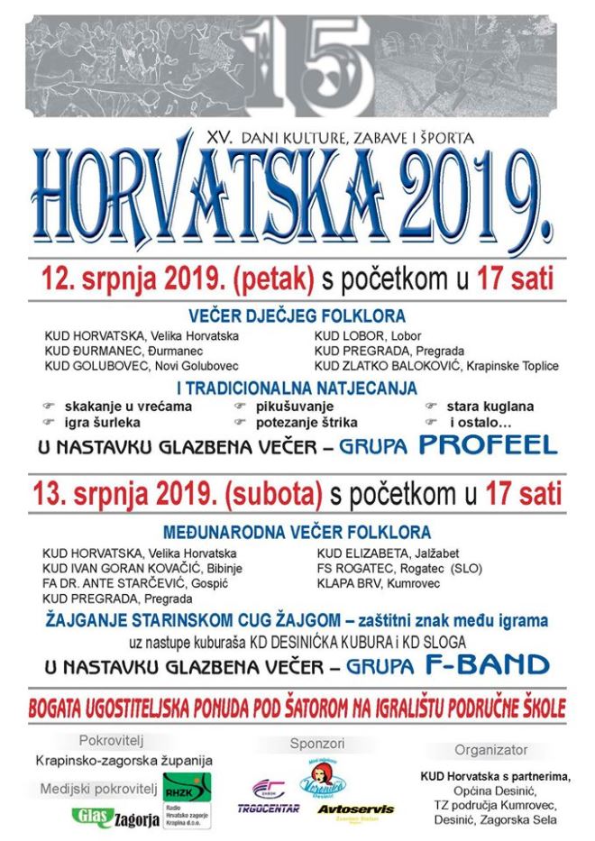 Kulturno – umjetničko društvo Horvatska s partnerima Općinom Desinić i Turističkom zajednicom područja Kumrovec, Desinić i Zagorska Sela u petak 12. i u subotu 13. srpnja organizira manifestaciju 15. Dani kulture, zabave i športa.