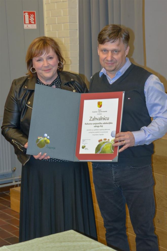 Svečanoj sjednici Skupštine Kulturno-umjetničke edukacijske udruge Kaj prisustvovala je i zamjenica župana Jasna Petek, koja je predsjedniku udruge Leonardu Fuliru i uručila zahvalnicu koju je udruzi povodom 30. godišnjice uspješnog djelovanja dodijelio župan Željko Kolar.