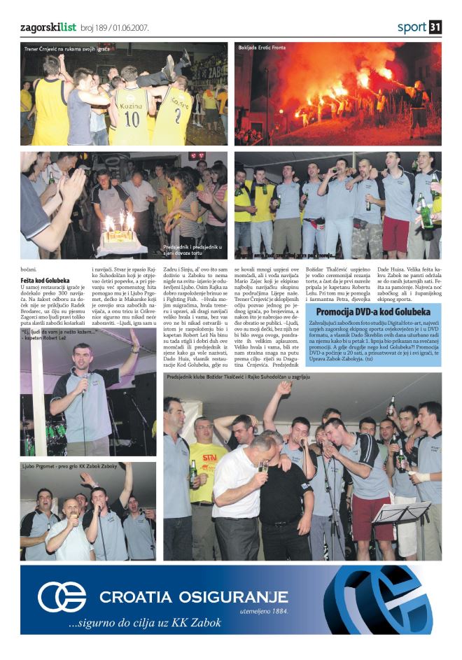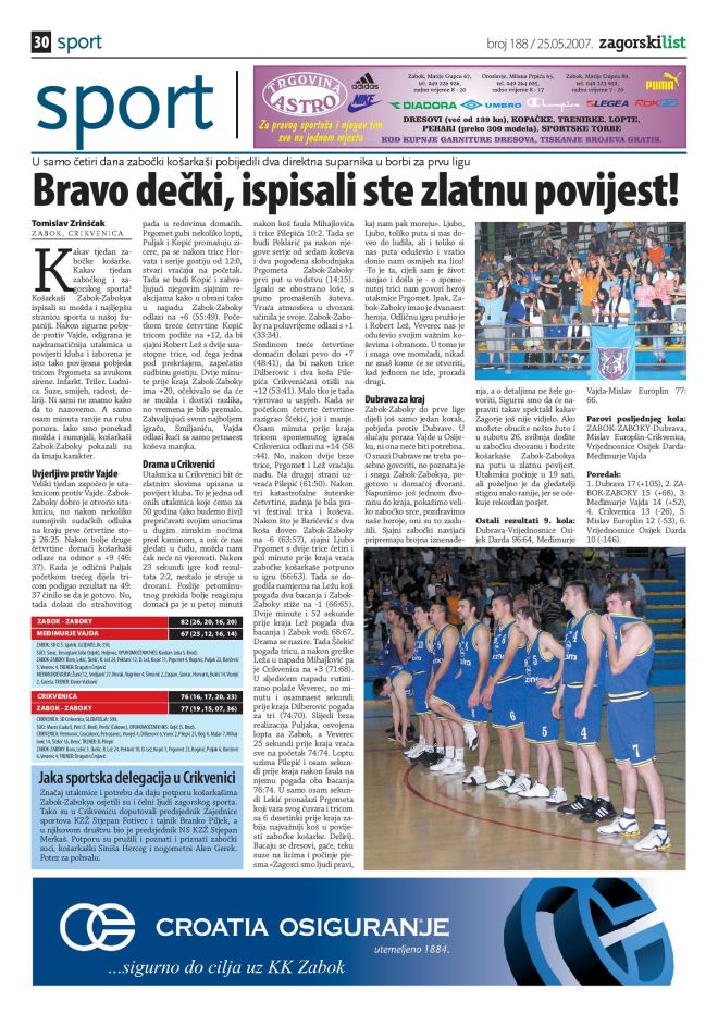 U ove ružne i tužne dane čovjeku svakako pomažu sjećanja na lijepe uspomene i vjera da će se one opet ponoviti. Jedna od najljepših i najdojmivljivijih sportskih od kada postoji Zagorski list svakako je plasman košarkaša Zaboka u prvu ligu nakon kvalifikacija 2007. godine. Bio je to najveći uspjeh zagorskog sporta u njegovoj novijoj povijesti. Sjajnom sinergijom igrača, vodstva kluba i navijača „zagorski cug“ koji je vozio po čitavoj „lijepoj našoj“ sretno je stigao na svoj cilj i ispisao zlatnu povijest. Zabok je taj svibanj 2007. živio zajedno s klubom. Glavne teme svih kava bile su utakmice, dvorana je bila dupkom puna, huk s tribina nosio je igrače na parketu.