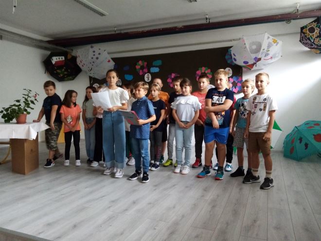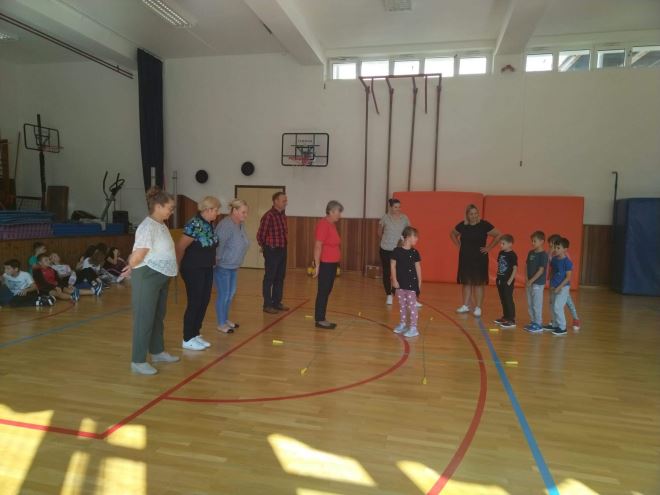 Ubrzo nakon toga su učenici ponovno preuzeli pozornicu pa su recitirali, glumili, pjevali i čitali svoje uratke o djedovima i bakama. Za kraj priredbe pripremljena je jedna zaboravljena priča. Iz školske kinodvorane svi su se preselili u sportsku dvoranu gdje su učiteljice pripremile razne igre za sve generacije. Razgibavanje je započelo opće pripremnim vježbama, a nakon toga su krenule štafetne igre prenošenja lopte iznad glave. Vijače se ovaj put nisu preskakivale, već su poslužile za igru Križić kružić pa su tako bake i djedovi pokazali snalažljivost i spretnost, a na kraju se i plesalo.