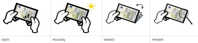 Za lakšu provjeru autentičnosti HNB preporučuje četiri koraka: osjeti, pogledaj, nakreći, provjeri.