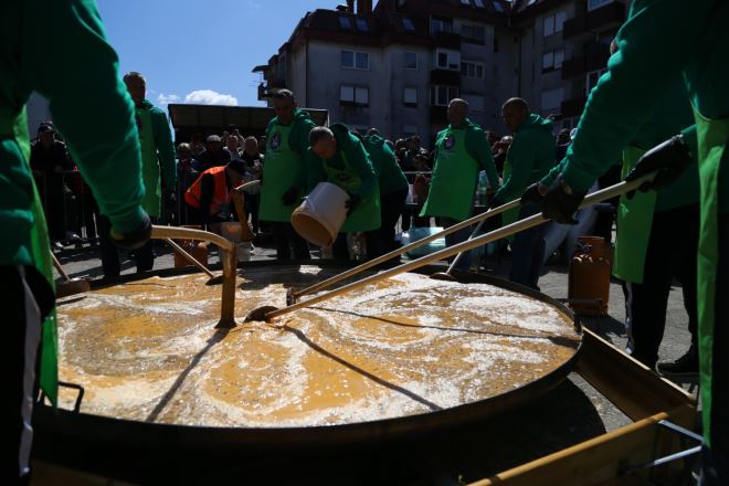 Trinaesteročlana kuharska ekipa, na čelu sa majstorom Stjepanom Kahlinom, uhvatila se u 'koštac' s čak 50 kilograma špeka, 20 kilograma luka, 30 kilograma šampinjona i 5 000 jaja, kako bi napravili deliciju koju će podijeliti posjetiteljima.