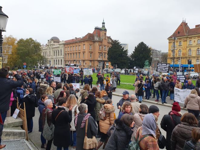 Danas se u 12 na Trgu bana Josipa Jelaćića održava se veliki prosvjed prosvjetnih djelatnika pod nazivom 'Hrvatska mora bolje. Iz Krapinsko-zagorske županije krenulo je više od 700 djelatnika na prosvjed, rekli su nam Dinko Prpić, povjerenik Sindikata hrvatskih učitelja Krapinsko – zagorske županije te Roman Balen povjerenik Nezavisnih sindikata zaposlenih u srednjih školama. Organizatori očekuju dolazak dvadesetak tisuća ljudi. U tijeku je okupljanje prosvjetnih djelatnika kod HNK-a. Oko 11 će prosvjednici krenuti Masarykovom ulicom preko Gundulićeve i Ilice, a sam će se prosvjed održati na Trgu bana Josipa Jelačića koji počinje u 12:05. Okupilo se mnoštvo prosvjetara koji zviždaju, ali i nose transparente. Jedan od transparenta prosvjednika je 'Sebi ste doveli Ligu za prvaka, a nas izbacili u ligu za bedaka' i 'Učitelji nisu ovce'.