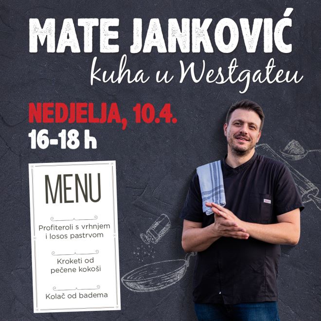 Nismo zaboravili ni na odličnu hranu, u nedjelju 10.travnja u Westgate stiže vrhunski Chef Mate Janković koji će za posjetitelje pripremati svoje specijalitete na radost svih gurmana. Poslastice Mate Jankovića obradovat će i najzahtjevnija nepca svojim kuharskim umijećem i zanimljivim receptima.