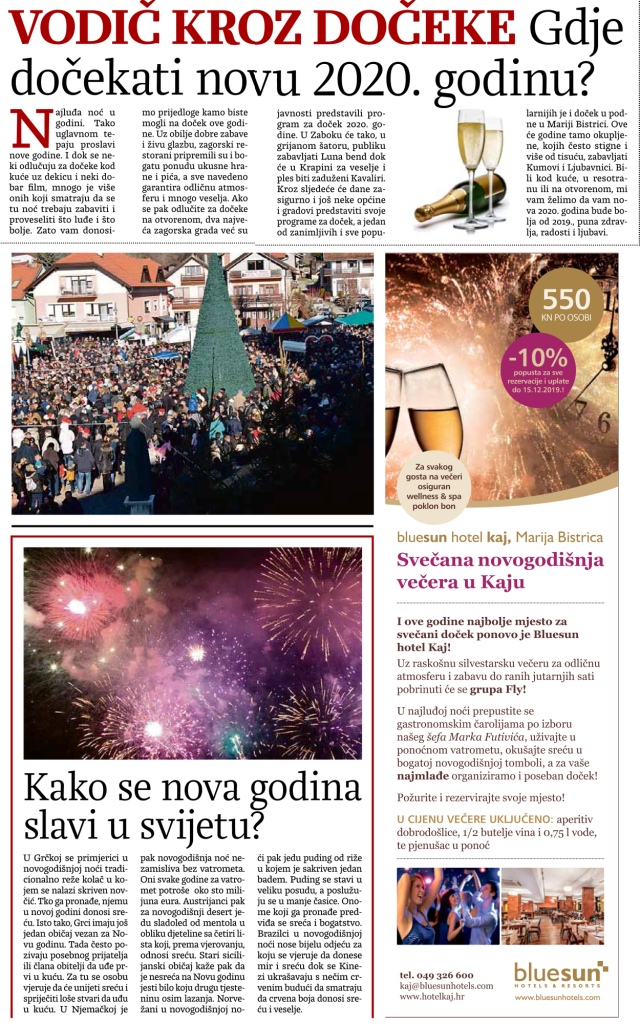 Najluđa noć u godini. Tako uglavnom tepaju proslavi nove godine. I dok se neki odlučuju za dočeke kod kuće uz dekicu i neki dobar film, mnogo je više onih koji smatraju da se tu noć trebaju zabaviti i proveseliti što luđe i što bolje. Zato vam donosimo prijedloge kamo biste mogli na doček ove godine. Uz obilje dobre zabave i živu glazbu, zagorski restorani pripremili su i bogatu ponudu ukusne hrane i pića, a sve navedeno garantira odličnu atmosferu i mnogo veselja. Ako se pak odlučite za dočeke na otvorenom, dva najveća zagorska grada već su javnosti predstavili program za doček 2020. godine. U Zaboku će tako, u grijanom šatoru, publiku zabavljati Luna bend dok će u Krapini za veselje i ples biti zaduženi Kavaliri. Kroz sljedeće će dane zasigurno i još neke općine i gradovi predstaviti svoje programe za doček, a jedan od zanimljivih i sve popularnijih je i doček u podne u Mariji Bistrici. Ove će godine tamo okupljene, kojih često stigne i više od tisuću, zabavljati Kumovi i Ljubavnici. Bili kod kuće, u resotranu ili na otvorenom, mi vam želimo da vam nova 2020. godina bude bolja od 2019., puna zdravlja, radosti i ljubavi.