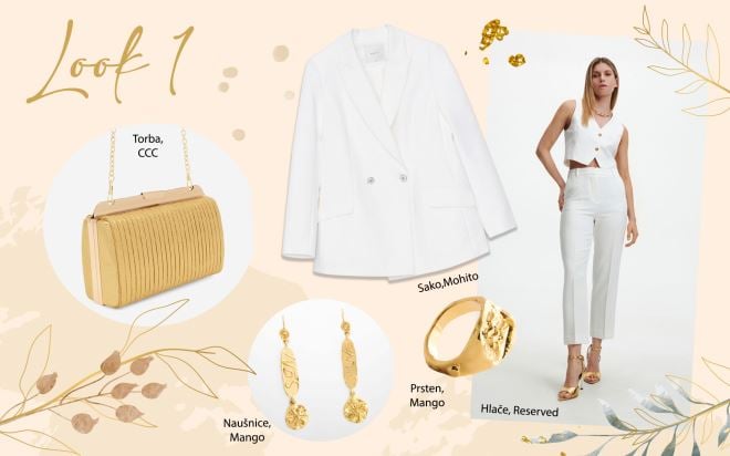 Bijela odjeća od glave do pete stvara čist, elegantnan i potpuno samouvjeren look. Mi smo za početak izabrale hlače i sako, a kako bi look bio potpun zlatni nakit dodat će prekrasan kontrast jednostavnom, a opet efektnom izgledu.