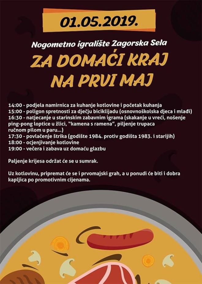 Na nogometnom igralištu u Zagorskim Selima na 1. svibanj održat će se prigodno druženje pod nazivom 'Za domaći kraj na prvi maj'.