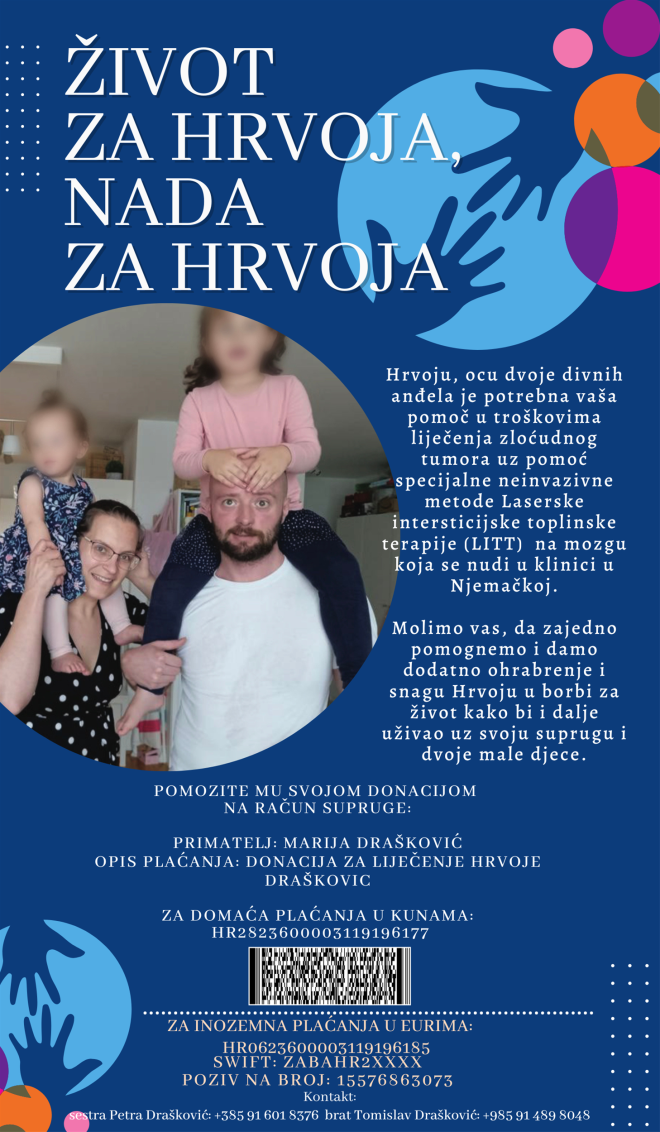 U subotu će se diljem Zagorja održati niz humanitarnih druženja za liječenje Hrvoja Draškovića, brižnog supruga i oca dvije malene djevojčice suočenog s povratkom najsmrtonosnijeg oblika tumora mozga. Hrvoje se s tumorom bori već četiri godine. Bio je podvrgnut višestrukim zračenjima, kemoterapijama i invazivnim operacijama uklanjanja tumora te se u jednom trenutku čak činilo da je pobijedio zloćudnu bolest. Ona se nažalost vratila te je jedva vidljivi tumor u nekoliko mjeseci narastao do veličine od sedam centimetara. Dosadašnje dugotrajno liječenje je Hrvojevu obitelj financijski posve iscrpilo, zbog njegovi prijatelji organiziraju veliku humanitarnu akciju koja će mu omogućiti odlazak na zahvat čiji se troškovi procjenjuju na čak 90.000 eura.Radi se o laserskoj interstikcijskoj toplinskoj terapiji, sigurnijem obliku operacije sa obećavajućim rezultatima.