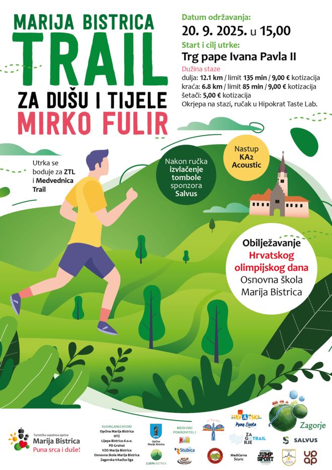 Manifestacija ''Ljeto u Mariji Bistrici'' TZ općine Marija Bistrica završava u subotu. Na rasporedu dva događanja, Na parkiralištu kod obilaznice na rasporedu je 3. zagorski street style show, a zadnji događaj ''Ljeta u Mariji Bistrici'' ove godine je Trail za dušu i tijele Mirko Fulir, koji je na rasporedu u subotu sa startom i ciljem na središnjem bistričkom trgu. Start je u 15 sati, a prijavljeno je više od 200 natjecatelja.