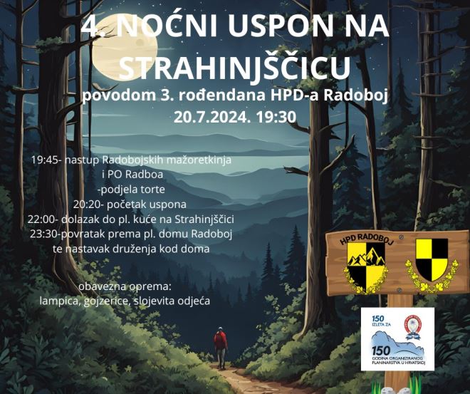 U organizaciji HPD-a Radoboj i Općine Radoboj za sve ljubitelje planinarenja sprema se 20. srpnja 2024., u subotu, 4. noćni uspon na Strahinjčicu.